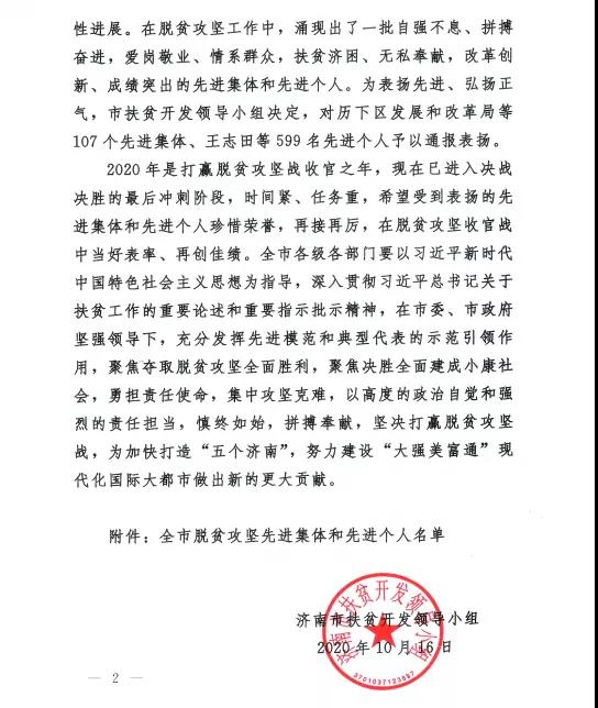 近日,濟南市扶貧開發(fā)領導小組發(fā)布《濟南市扶貧開發(fā)領導小組關于表揚全市脫貧攻堅先進集體和先進個人的通報》,長田實業(yè)董事長張勇榮獲全市“脫貧攻堅先進個人”榮譽稱號。