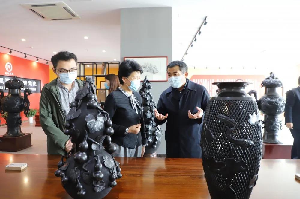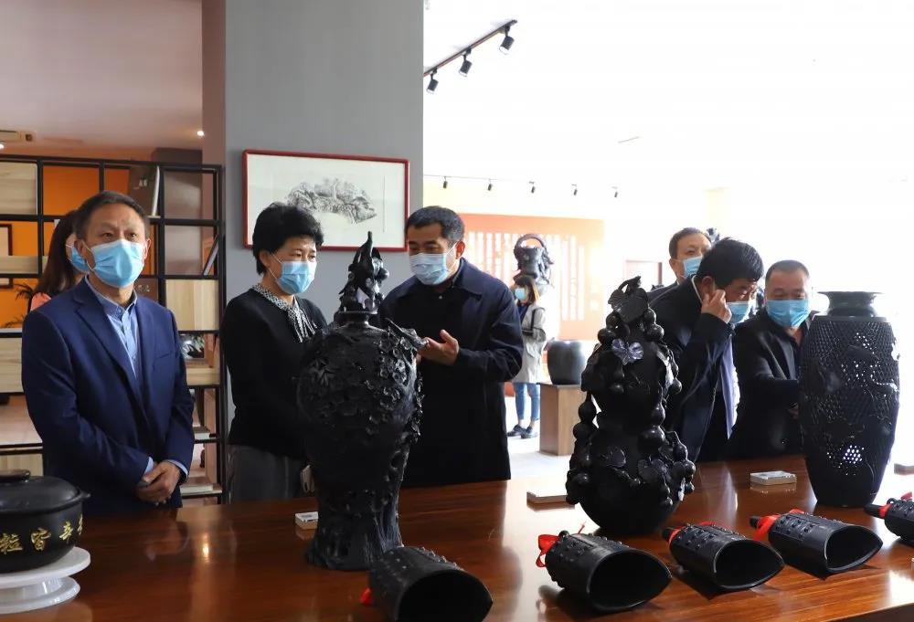 王廷琦一行來到濟南龍格黑陶藝術(shù)研究院,聽取了長田實業(yè)董事長張勇關(guān)于龍格黑陶項目運營理念、創(chuàng)意研發(fā)、發(fā)展規(guī)劃等方面匯報。濟南龍格黑陶藝術(shù)研究院的市非物質(zhì)文化遺產(chǎn)黑陶制作技藝傳承人徐慶增向調(diào)研組一行介紹了龍格黑陶的燒制工藝、文化寓意及代表作品。調(diào)研中,王廷琦對龍格黑陶文化產(chǎn)業(yè)保護及經(jīng)營發(fā)展所取得的成績表示充分肯定,并就龍格黑陶的長遠發(fā)展提出了寶貴意見。