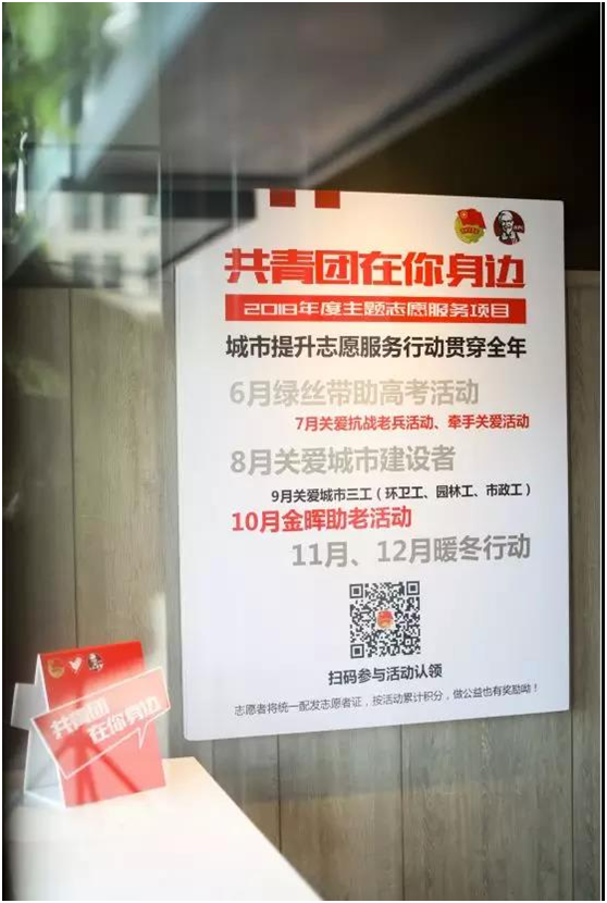 在志愿服務(wù)項(xiàng)目正式啟動(dòng)后,華百廣場肯德基餐廳將設(shè)立“志愿服務(wù)招募信息墻”,定期發(fā)布由共青團(tuán)濟(jì)陽縣委組織的志愿活動(dòng)招募信息,消費(fèi)者進(jìn)店后可掃描信息墻上的二維碼進(jìn)入共青團(tuán)濟(jì)陽縣委網(wǎng)站、瀏覽報(bào)名參加志愿服務(wù)活動(dòng),同時(shí)餐廳還將長期開展環(huán)衛(wèi)工人關(guān)懷活動(dòng),隨時(shí)歡迎環(huán)衛(wèi)工人進(jìn)店歇歇腳、喝杯水、熱熱飯。