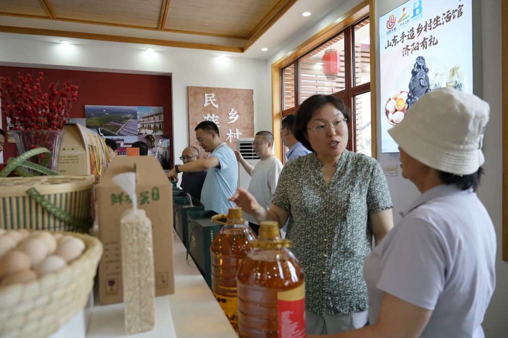 考察團(tuán)一行實(shí)地參觀了長田實(shí)業(yè)在濟(jì)陽街道董家村的產(chǎn)業(yè)布局和相關(guān)配套設(shè)施建設(shè)。首先參觀的是易豐居,室內(nèi)的農(nóng)產(chǎn)品展示臺(tái)上擺放著自種自養(yǎng)自產(chǎn)的各類生態(tài)產(chǎn)品,工作人員向大家詳細(xì)介紹了農(nóng)產(chǎn)品的來源及銷售情況。