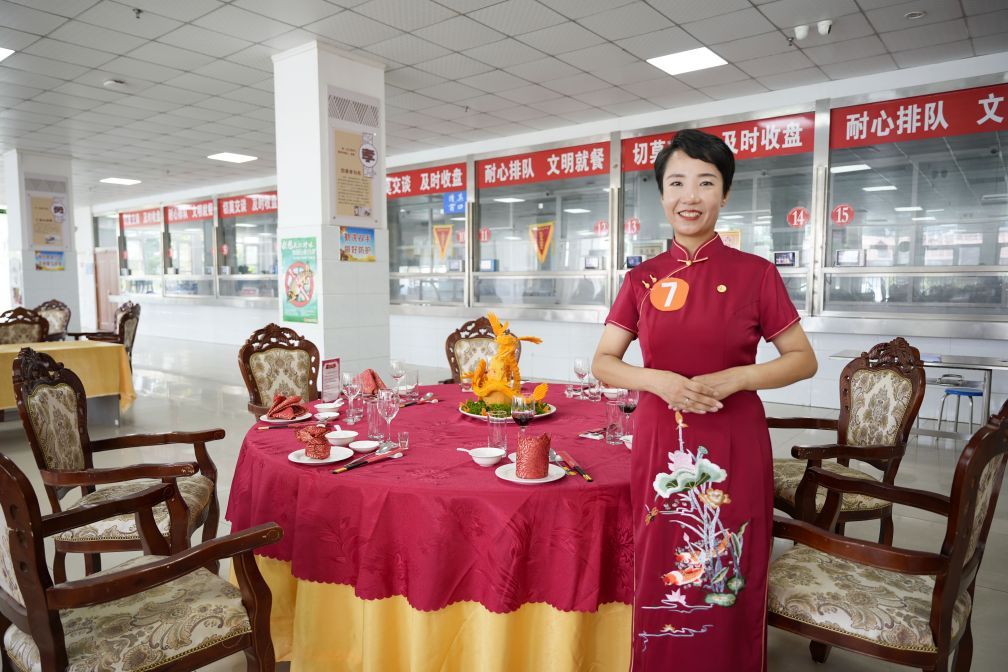在餐廳服務(wù)員的比賽中,長田餐飲團(tuán)隊(duì)所呈現(xiàn)的中餐宴會擺臺技藝卓越,創(chuàng)意層出不窮。其精心設(shè)計(jì)的龍鳳呈祥宴、聞韶養(yǎng)生宴、五谷豐登宴、福如東海宴、泉城人家宴、金榜題名宴等主題,借助桌布、餐具與臺面裝飾的巧妙搭配,生動地呈現(xiàn)在每一張餐桌上。選手們優(yōu)雅的姿態(tài)、專業(yè)的操作手法和精美的臺面設(shè)計(jì),不僅為賽事帶來了一場視覺藝術(shù)的盛宴,更深刻地展示了中餐文化的博大精深與獨(dú)特魅力。