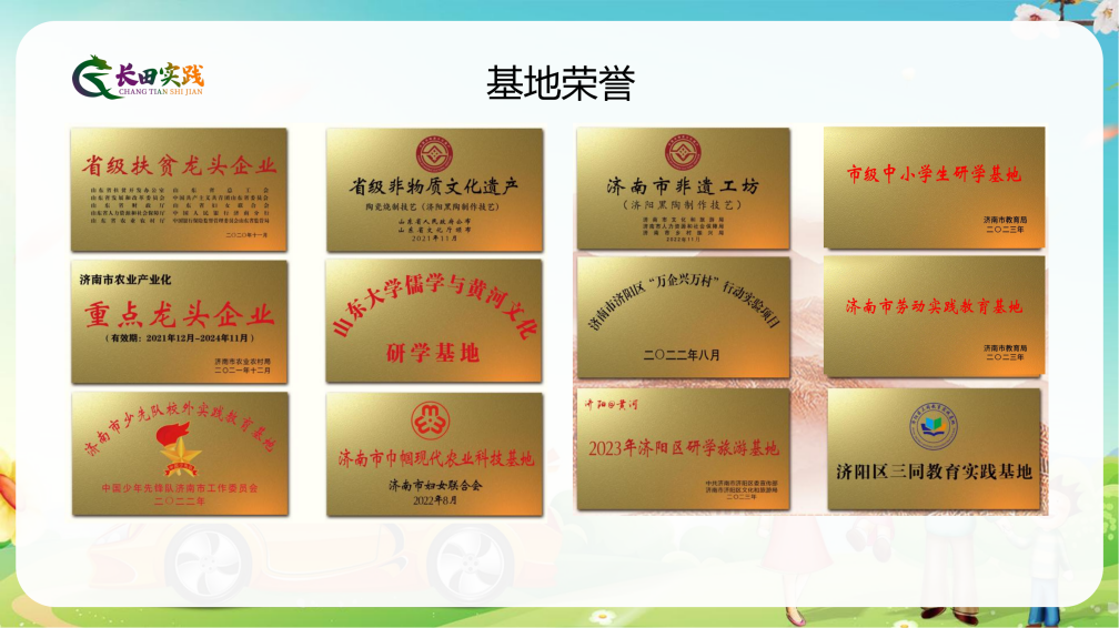 截至目前,長田實踐教育基地已服務(wù)來自省市、區(qū)的30000余名中小學(xué)生,被認定為“新時代文明實踐基地”“山東龍山文化陶藝研學(xué)基地”“山東大學(xué)儒學(xué)與黃河文化研學(xué)基地”“濟南市少先隊校外實踐基地”“濟南市中小學(xué)生研學(xué)基地”“濟南市勞動教育實踐基地”。