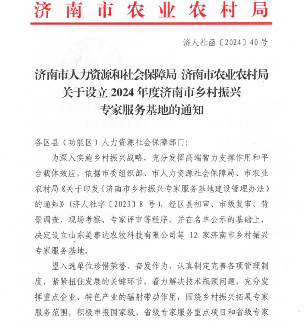 12月31日,中共濟(jì)南市委組織部、濟(jì)南市人力資源和社會(huì)保障局、濟(jì)南市農(nóng)業(yè)農(nóng)村局下發(fā)《關(guān)于設(shè)立2024 年度濟(jì)南市鄉(xiāng)村振興專家服務(wù)基地的通知》,經(jīng)過(guò)嚴(yán)格評(píng)審與層層篩選,濟(jì)南易豐農(nóng)業(yè)科技有限公司成功入選“2024年市級(jí)專家服務(wù)基地”,為專家服務(wù)鄉(xiāng)村振興提供平臺(tái)!