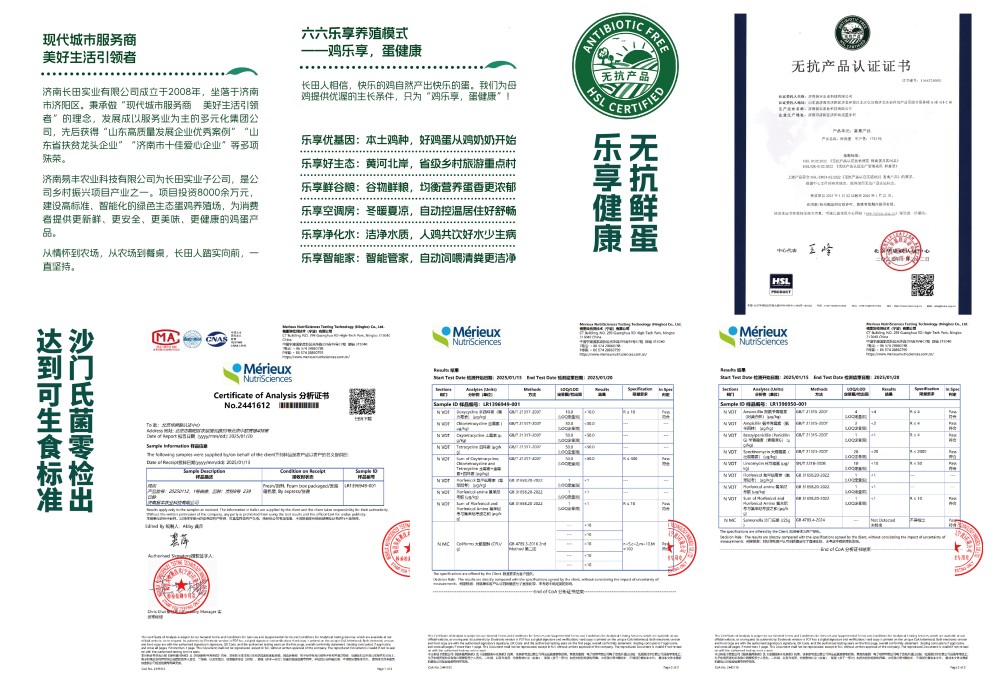 區(qū)別于傳統(tǒng)養(yǎng)殖模式,長田樂享創(chuàng)新構(gòu)建“六六樂享養(yǎng)殖體系”,以“優(yōu)基因、好生態(tài)、鮮谷糧、空調(diào)房、凈化水、智能家”打造高標(biāo)準(zhǔn)養(yǎng)殖體系。產(chǎn)品全程不添加激素和抗生素,配備蛋品清洗分級設(shè)備,嚴(yán)格把控品質(zhì),確保產(chǎn)品在消費者手中的新鮮度和安全性。長田樂享超鮮蛋獲得無抗產(chǎn)品認證。