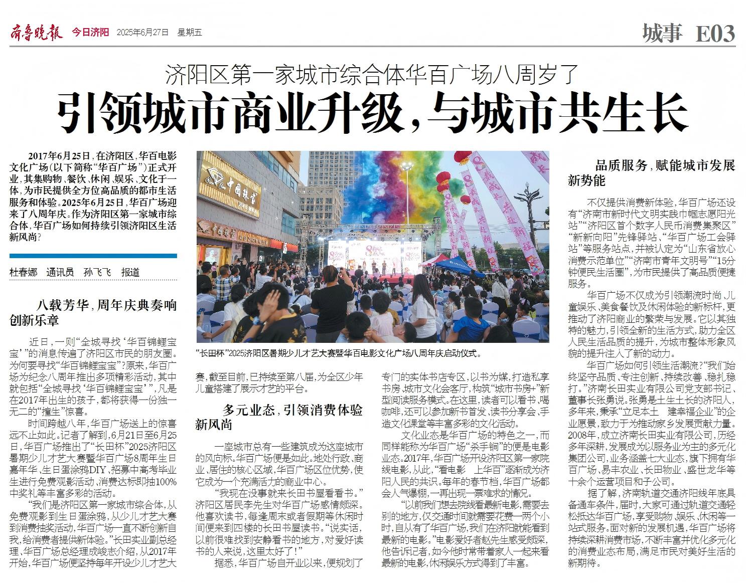 2017年6月25日,在濟陽區(qū),華百電影文化廣場(以下簡稱“華百廣場”)正式開業(yè),其集購物、餐飲、休閑、娛樂、文化于一體,為市民提供全方位高品質的都市生活服務和體驗。2025年6月25日,華百廣場迎來了八周年慶。作為濟陽區(qū)第一家城市綜合體,華百廣場如何持續(xù)引領濟陽區(qū)生活新風尚?