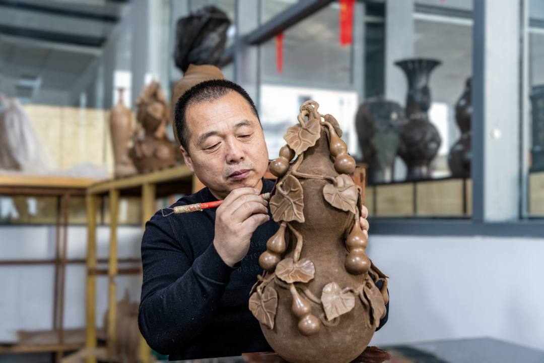 黑陶是華夏先民的黑色詩篇,作為土生土長的濟(jì)陽人,三十余載光陰里,徐慶增潛心研究黑陶,續(xù)寫這光輝的詩篇。如今,他的作品早已超越實(shí)用范疇,成為兼具藝術(shù)價(jià)值與文化厚度的非遺名片?!洱堯v盛世》以華夏龍為魂,將泥與火的淬煉推向極致。《福壽葫蘆》造型圓潤飽滿,釉色沉郁如墨玉,無需多言,一抹玄色間,福氣已悄然落定?!豆淖友砀琛穭t將田間地頭的歡騰瞬間凝固于陶面,讓人仿佛聽見咚咚的鼓點(diǎn),看見祖輩們在黃河邊舞出的煙火人間。這些凝聚著心血的創(chuàng)作,不僅是他個(gè)人的藝術(shù)成就,更成為高校非遺教學(xué)中鮮活的教材。